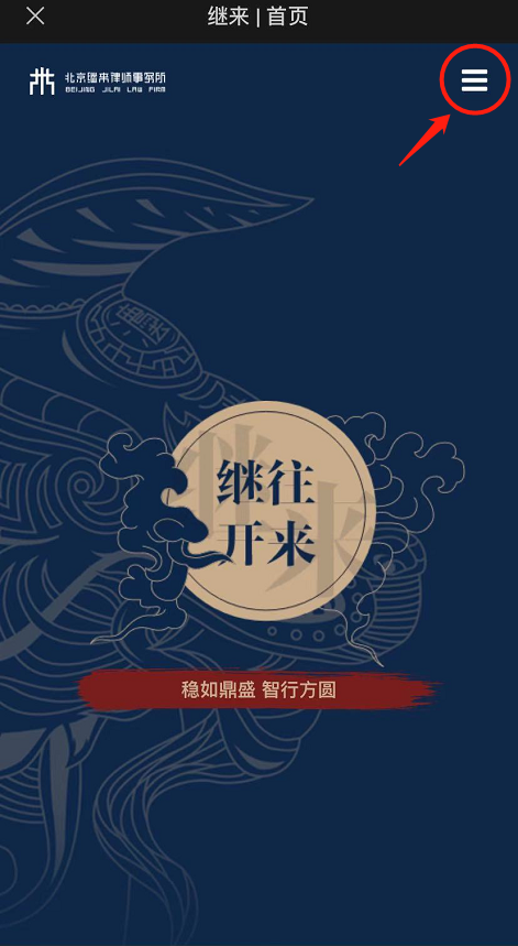 展示了网站的八大板块,两边由继来律所独创的“獬豸”头像以及中间红色背景下的“稳如鼎盛 智圆行方”体现了继来律所的品牌理念。