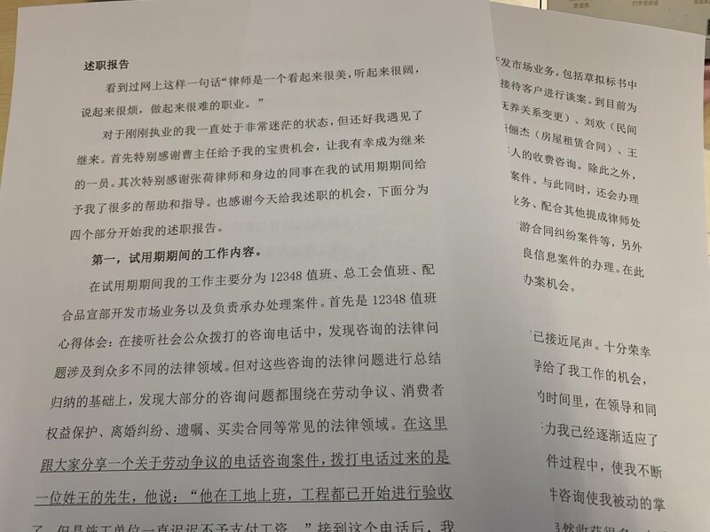 每一位述职律师在试用期的表现都很出色,但大家并没有骄傲自满,而是虚心地总结了自身业务水平和工作态度上的不足,民商部李晓萌律师更是在述职的时候准备了逐字稿认真朗读,希望自己能在日后的值班和谈案工作中掌握更多的经验与技巧。