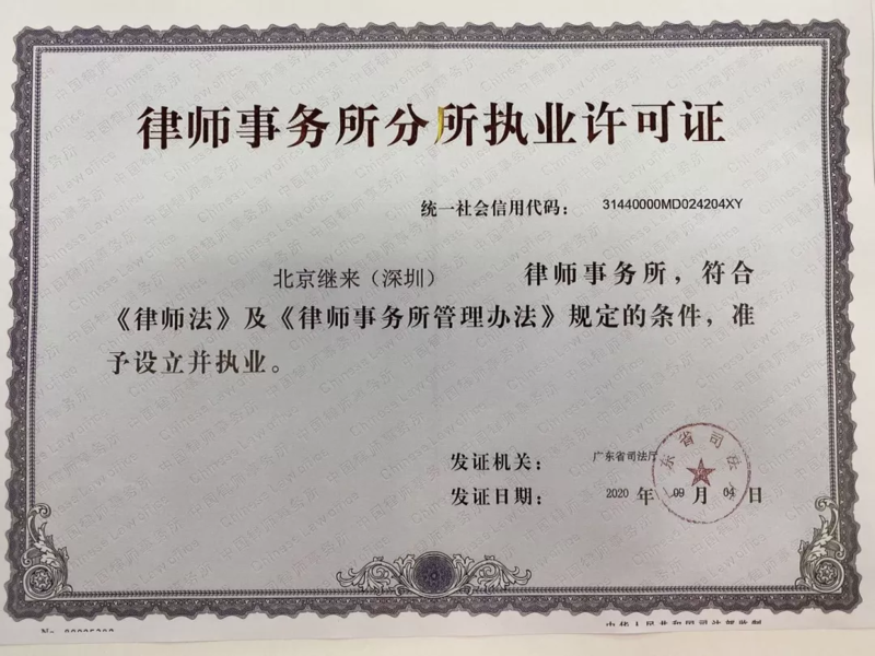 时维九月,序属三秋。2020年9月8日,北京继来(深圳)律师事务所经广东省司法厅批准设立并取得《律师事务所分所执业许可证》,标志着继来律师事务所国内首家分所——深圳分所正式成立。